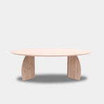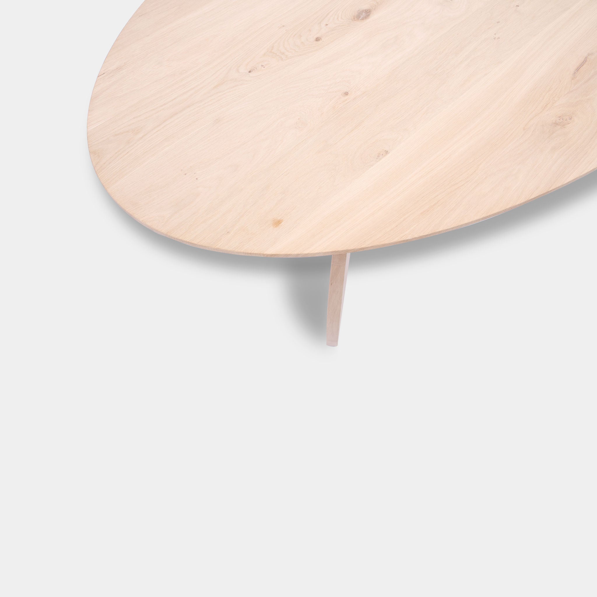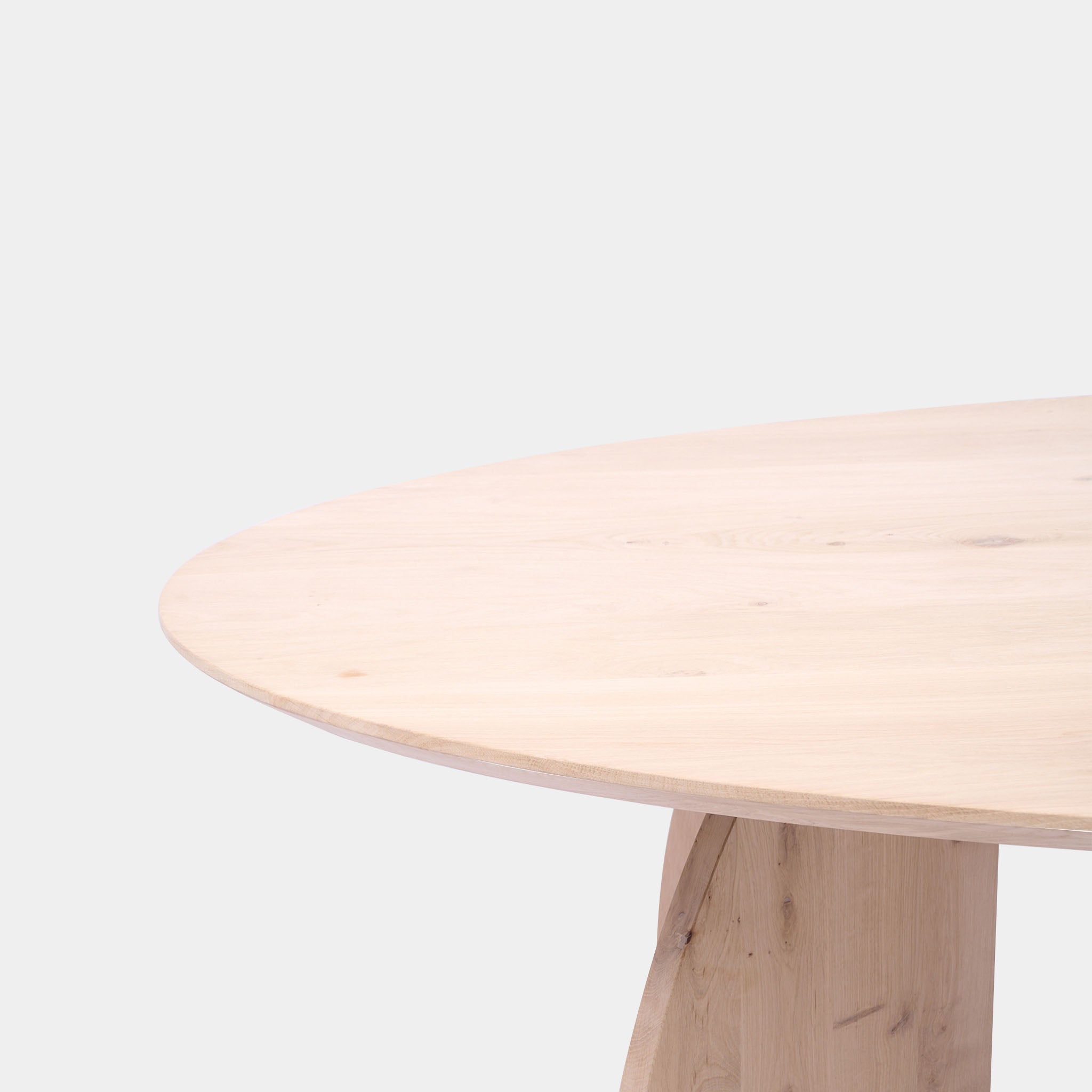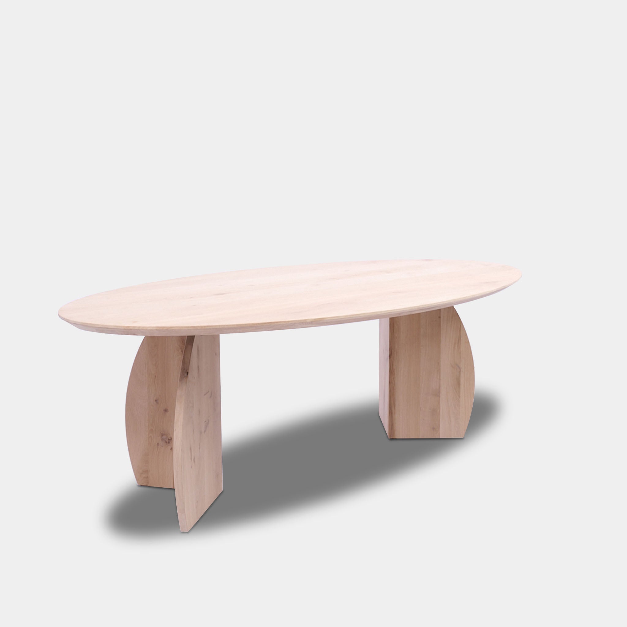 Deze unieke ovale tafel van massief eikenhout, uitgevoerd in een onbehandelde afwerking, combineert ambachtelijke puurheid met geometrisch design. De vloeiende, afgeronde vorm geeft de tafel een zachte en organische uitstraling, terwijl de set van twee driehoekige poten van massief eikenhout zorgt voor een krachtig en modern accent.