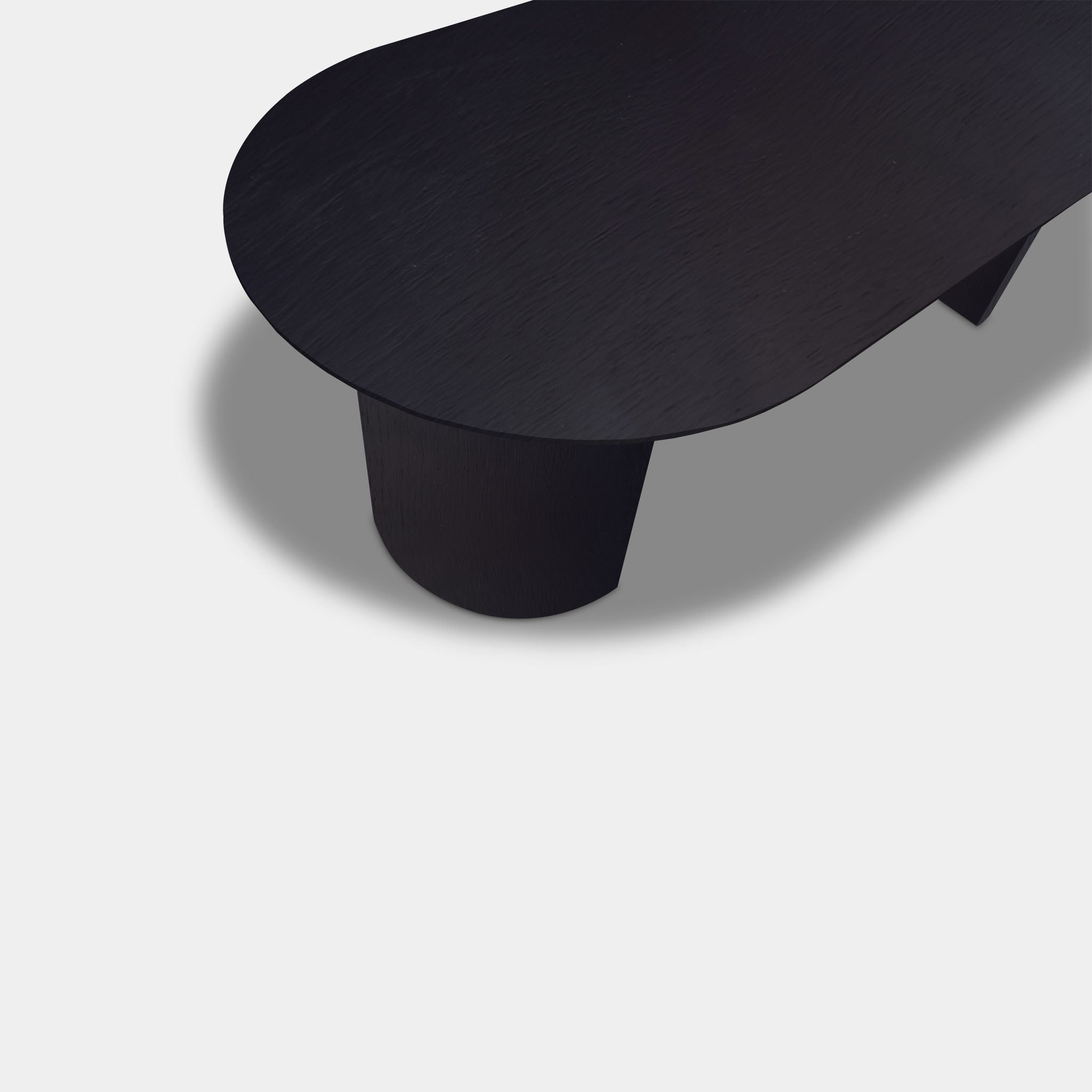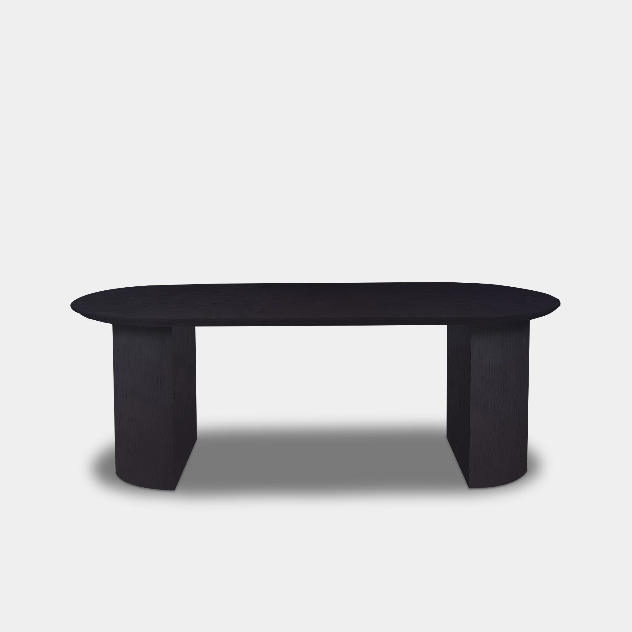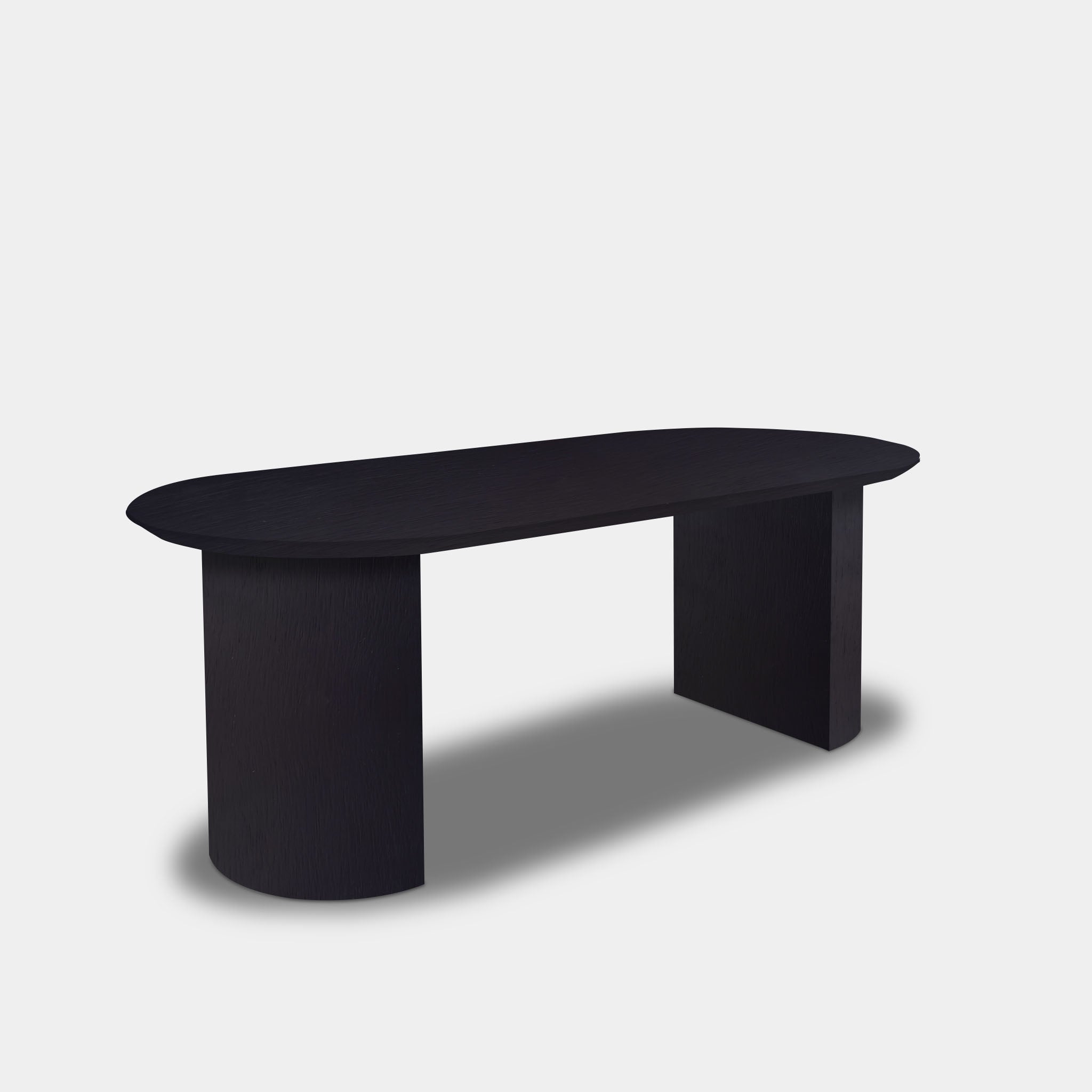Deze indrukwekkende plat ovale tafel van massief eikenhout, afgewerkt in de diepe, klassieke kleur Donker Eiken, straalt kracht, elegantie en ambachtelijke kwaliteit uit. De afgeronde, afgeplatte vorm geeft de tafel een vloeiende en uitnodigende uitstraling, terwijl het robuuste half rond onderstel, meegespoten in dezelfde tint, zorgt voor een solide en visueel gebalanceerd geheel.