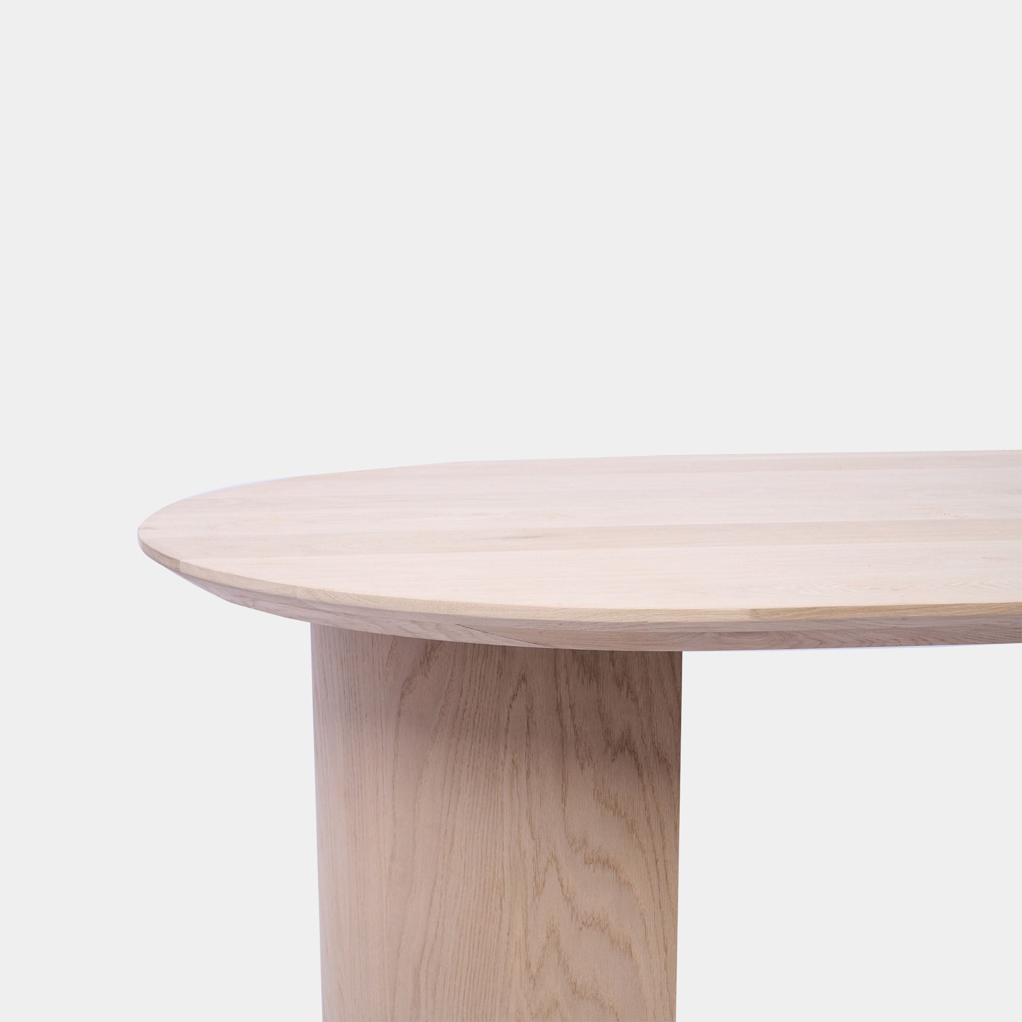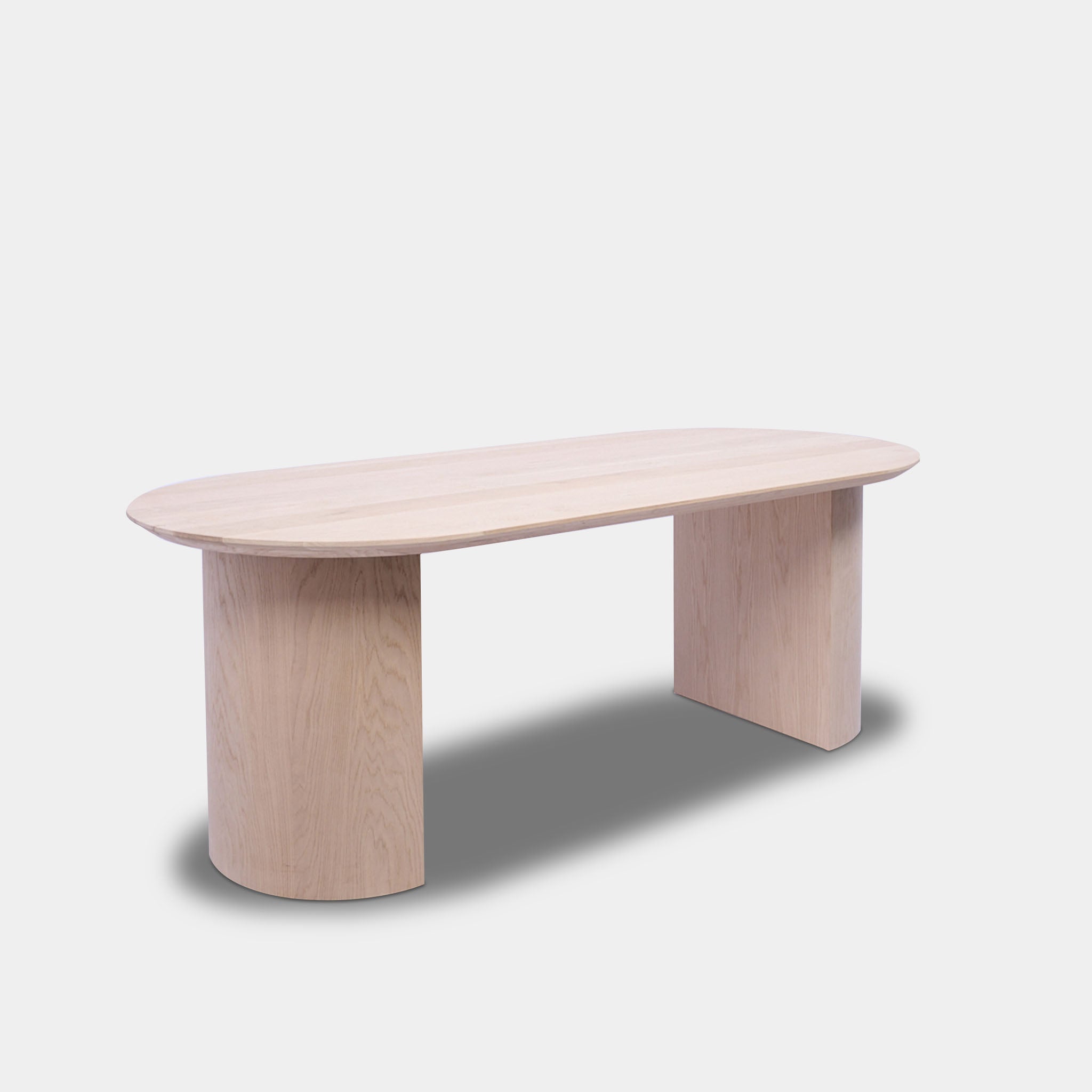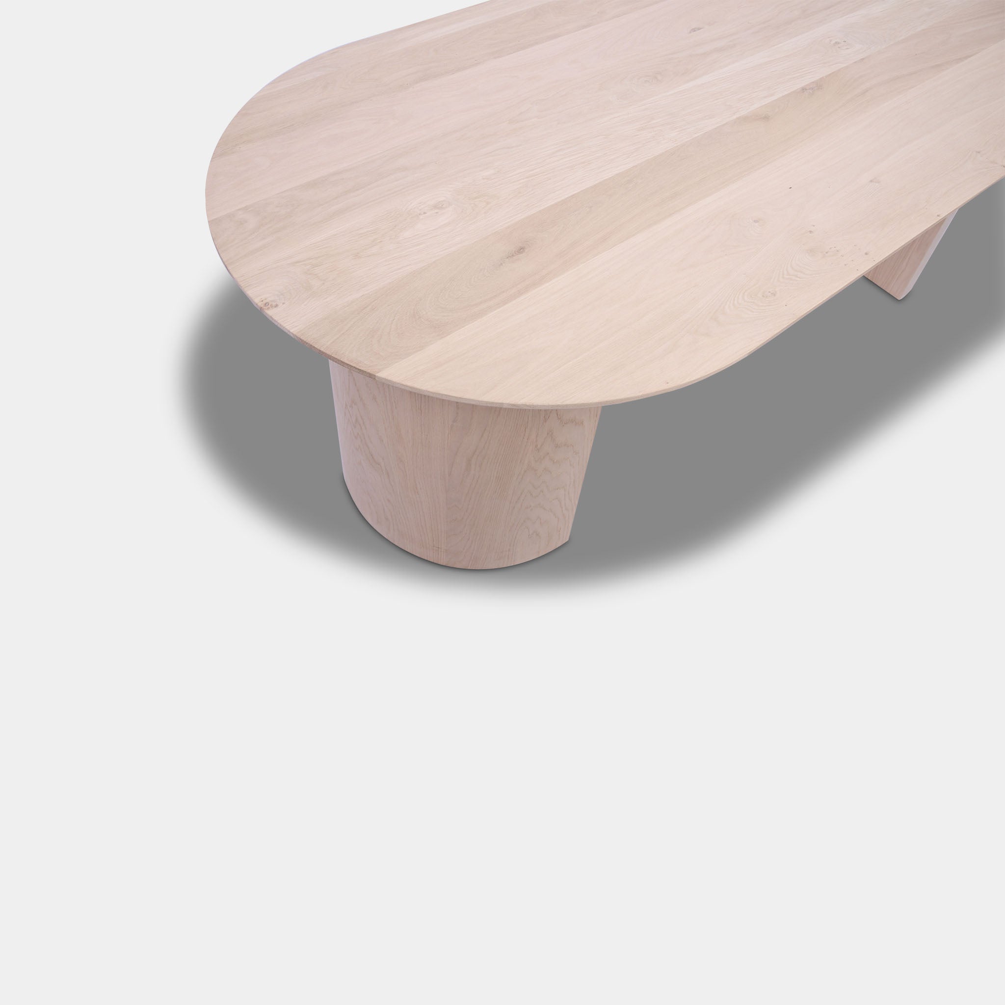 Deze stijlvolle plat ovale tafel van massief eikenhout, uitgevoerd in een onbehandelde afwerking, combineert natuurlijke puurheid met modern design. De afgeronde, afgeplatte vorm geeft de tafel een elegante en luchtige uitstraling, terwijl het robuuste half rond onderstel, volledig van eikenhout, zorgt voor een krachtige, organische basis.