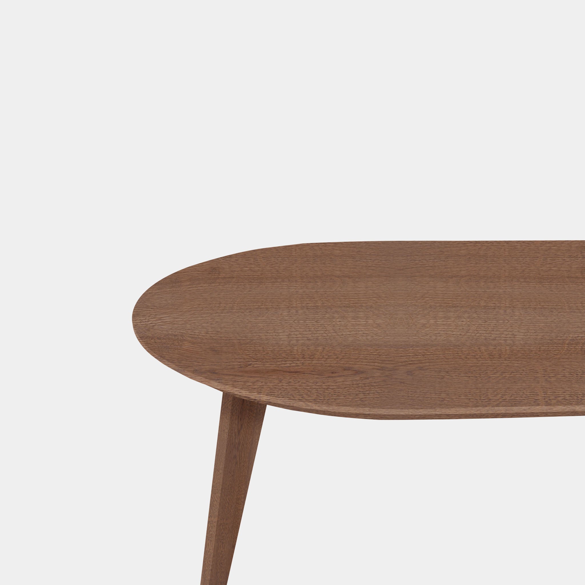 Deze warme en uitnodigende plat ovale tafel van massief eikenhout, afgewerkt in de rijke kleur Cinnamon, brengt natuurlijke elegantie samen met modern vakmanschap. Het afgeronde, afgeplatte blad zorgt voor een zacht, vloeiend silhouet, terwijl het stevige volledig houten onderstel, meegespoten in dezelfde tint, zorgt voor een visueel krachtig en stabiel geheel.