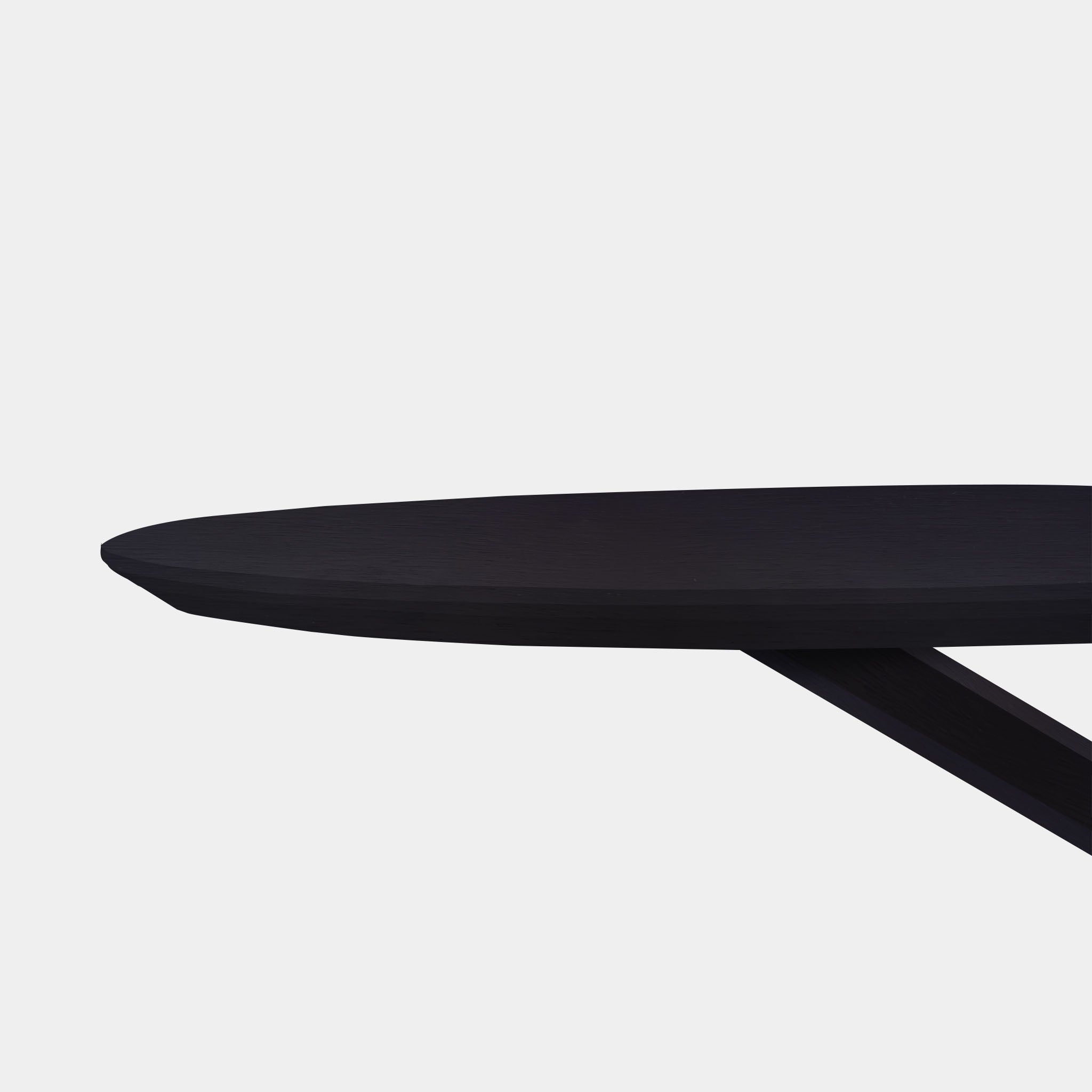 Deze indrukwekkende plat ovale tafel van massief eikenhout, afgewerkt in de diepe, klassieke kleur Donker Eiken, straalt kracht, elegantie en tijdloos vakmanschap uit. Het afgeronde blad met afgeplatte vorm geeft de tafel een moderne, vloeiende uitstraling, terwijl het robuuste houten matrix onderstel, meegespoten in dezelfde tint, zorgt voor een stabiele en stijlvolle basis.