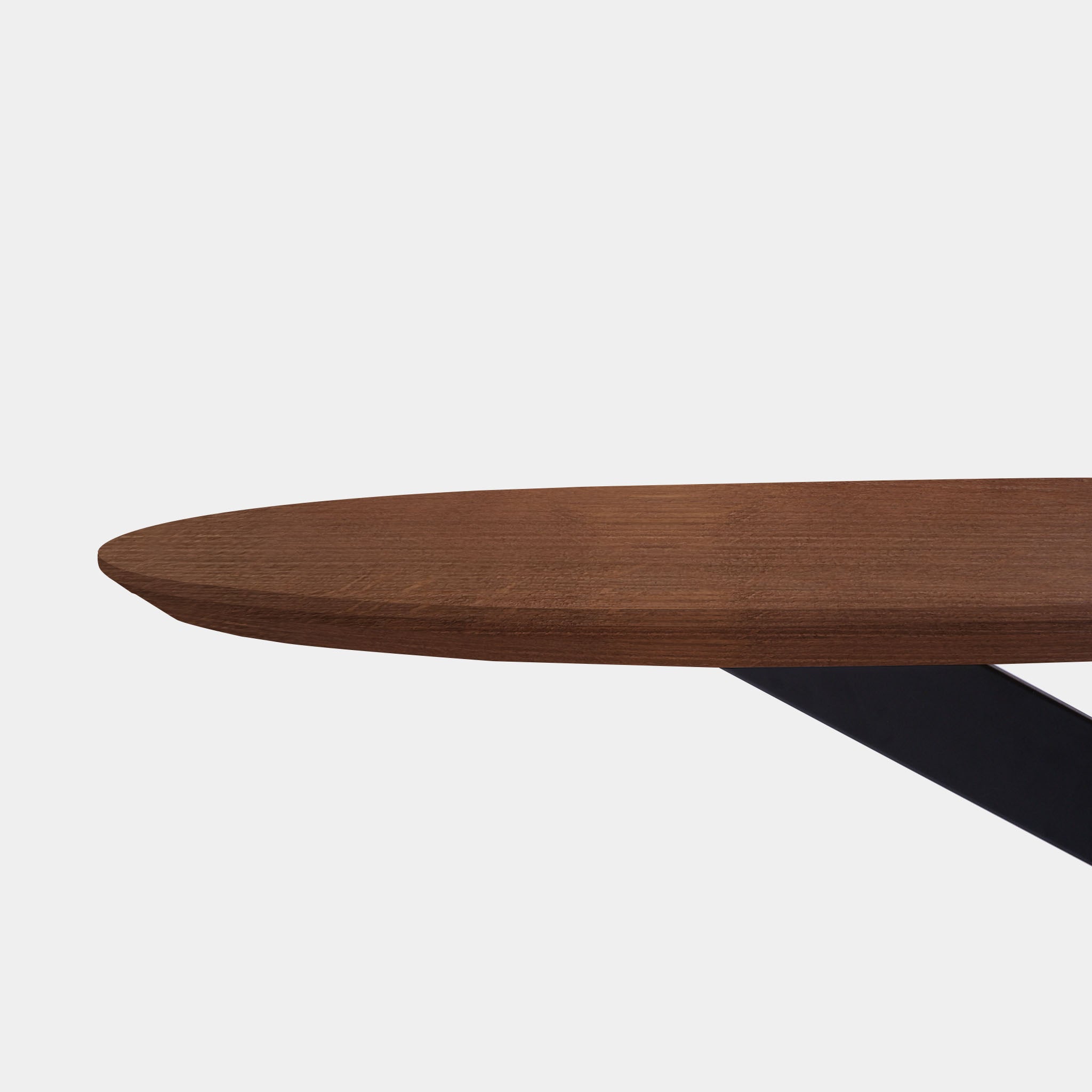 Deze karaktervolle plat ovale tafel van massief eikenhout, afgewerkt in de warme, mediterrane kleur Toscane 102, brengt zuidelijke elegantie samen met modern vakmanschap. Het unieke, afgeplatte ovale blad zorgt voor een luchtige en stijlvolle vorm, terwijl het zwarte matrix onderstel het geheel kracht en stabiliteit geeft.