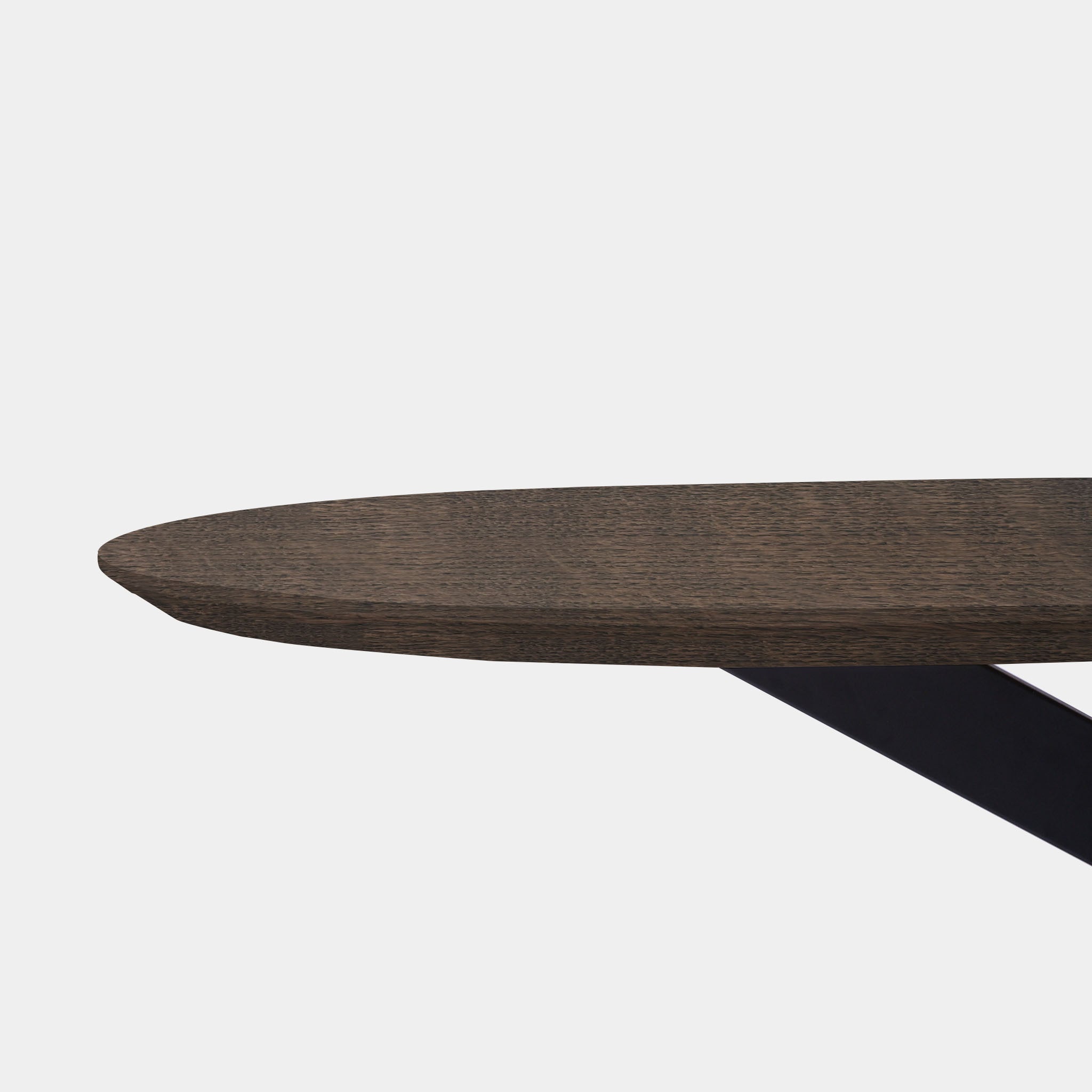 Deze elegante plat ovale tafel van massief eikenhout, afgewerkt in de rustige, natuurlijke kleur Zand, combineert zachte lijnen met een krachtig designstatement. Het afgeplatte ovale blad zorgt voor een moderne en vloeiende uitstraling, terwijl het robuuste Matrix XL onderstel extra stabiliteit en een industriële touch toevoegt.
