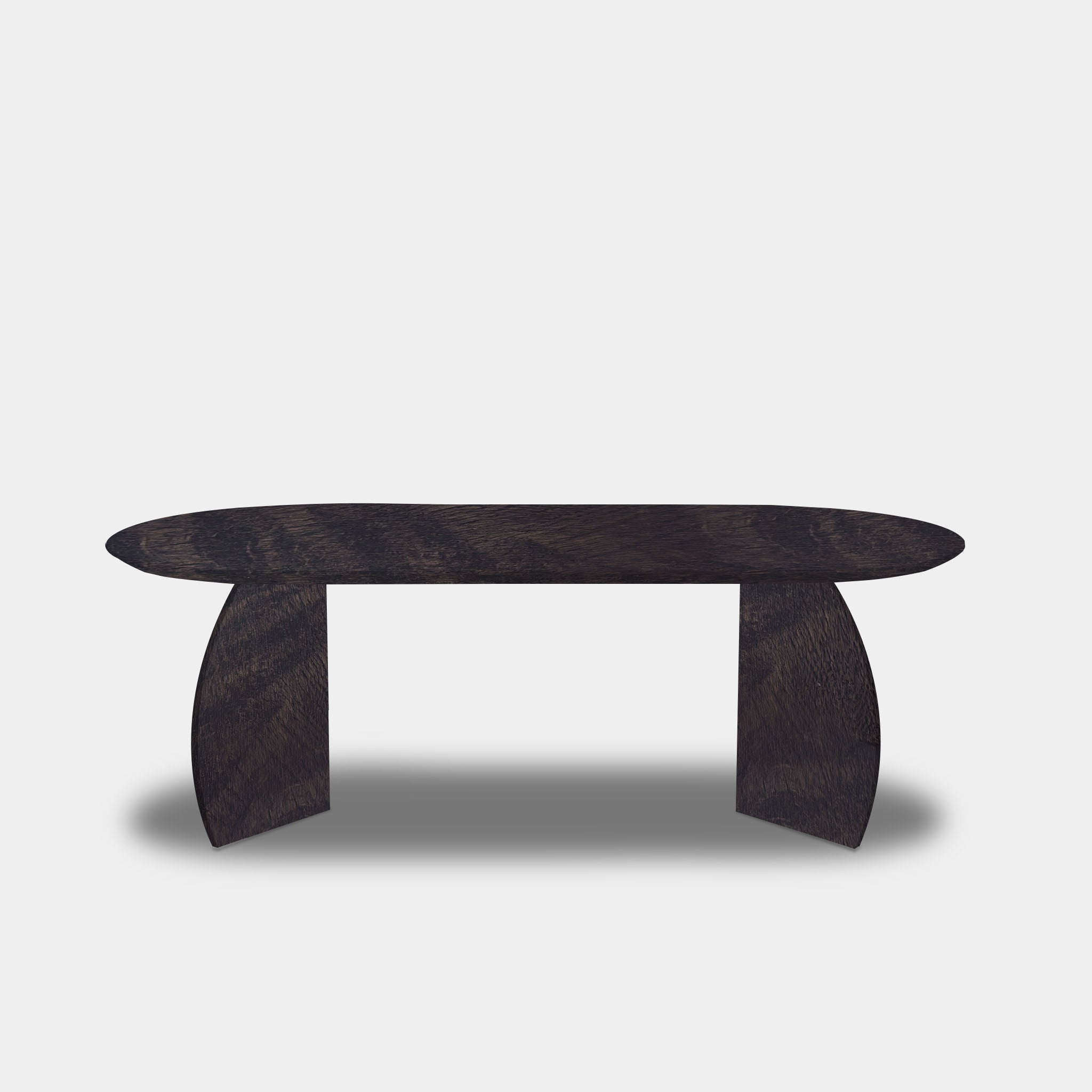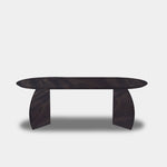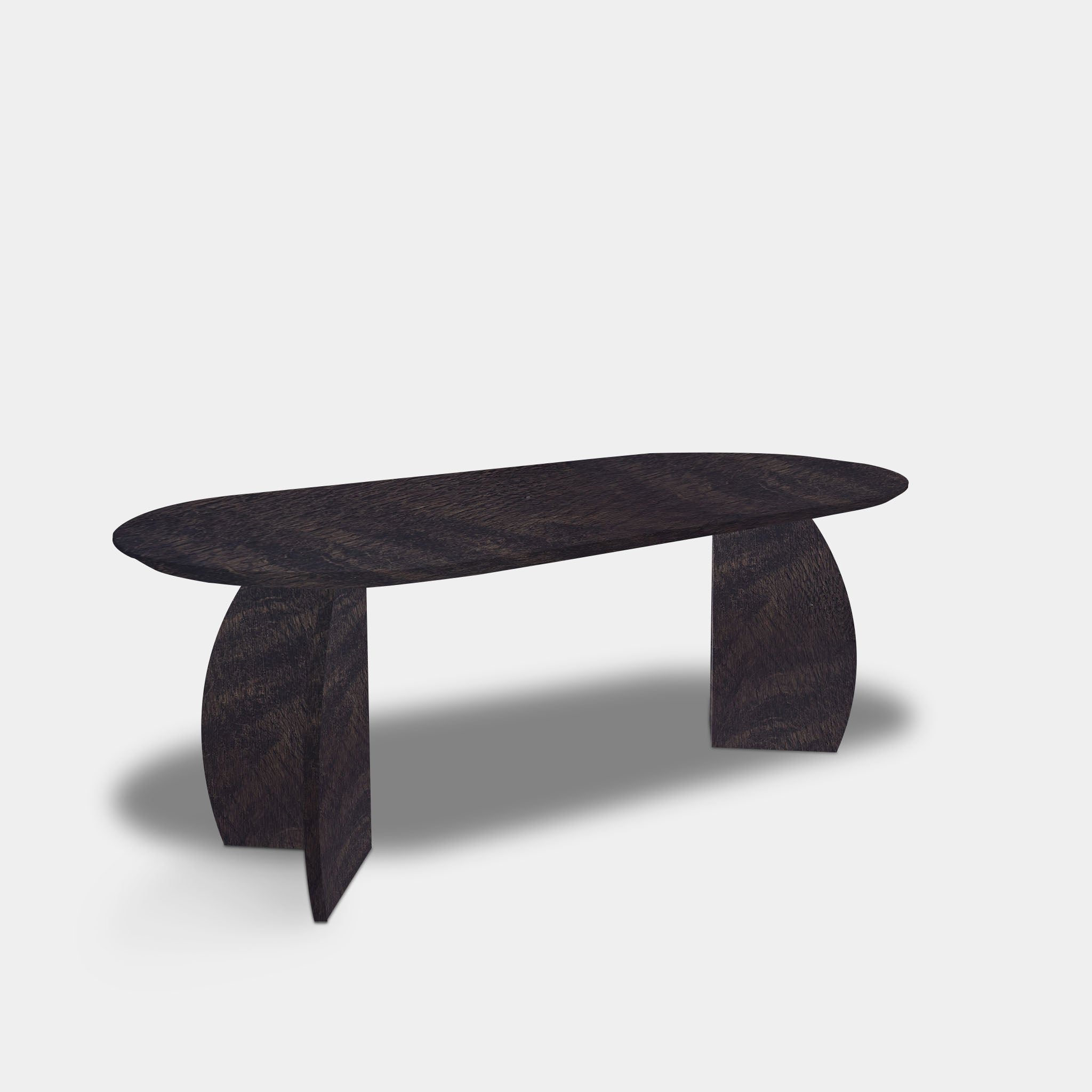 Deze moderne plat ovale tafel van massief eikenhout, afgewerkt in de diepe kleur Dark Grey, combineert kracht en verfijning met een tijdloos ontwerp. Het afgeplatte ovale blad zorgt voor een strak, vloeiend silhouet, terwijl het robuuste half rond onderstel, meegespoten in dezelfde kleur, zorgt voor een krachtig en stijlvol fundament.