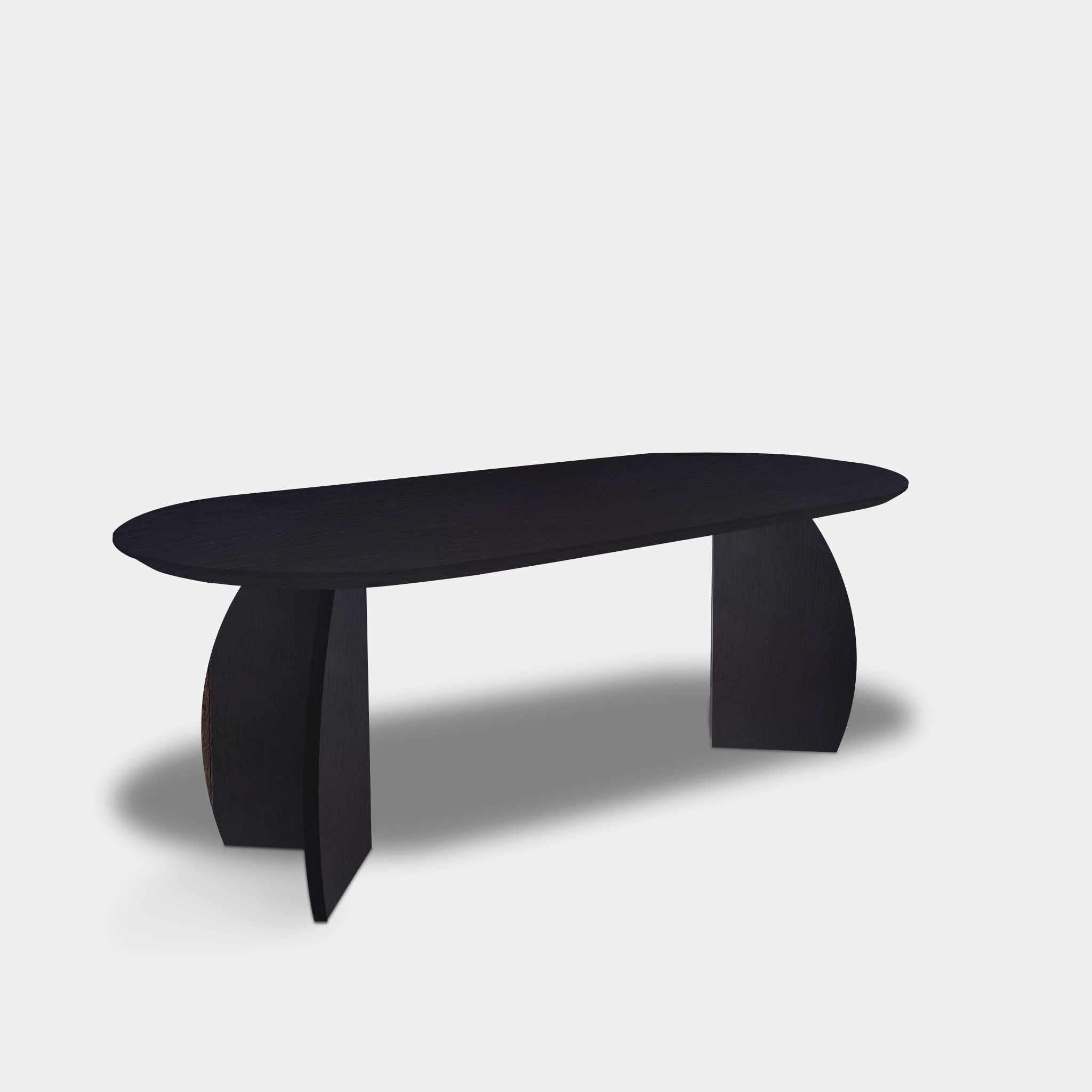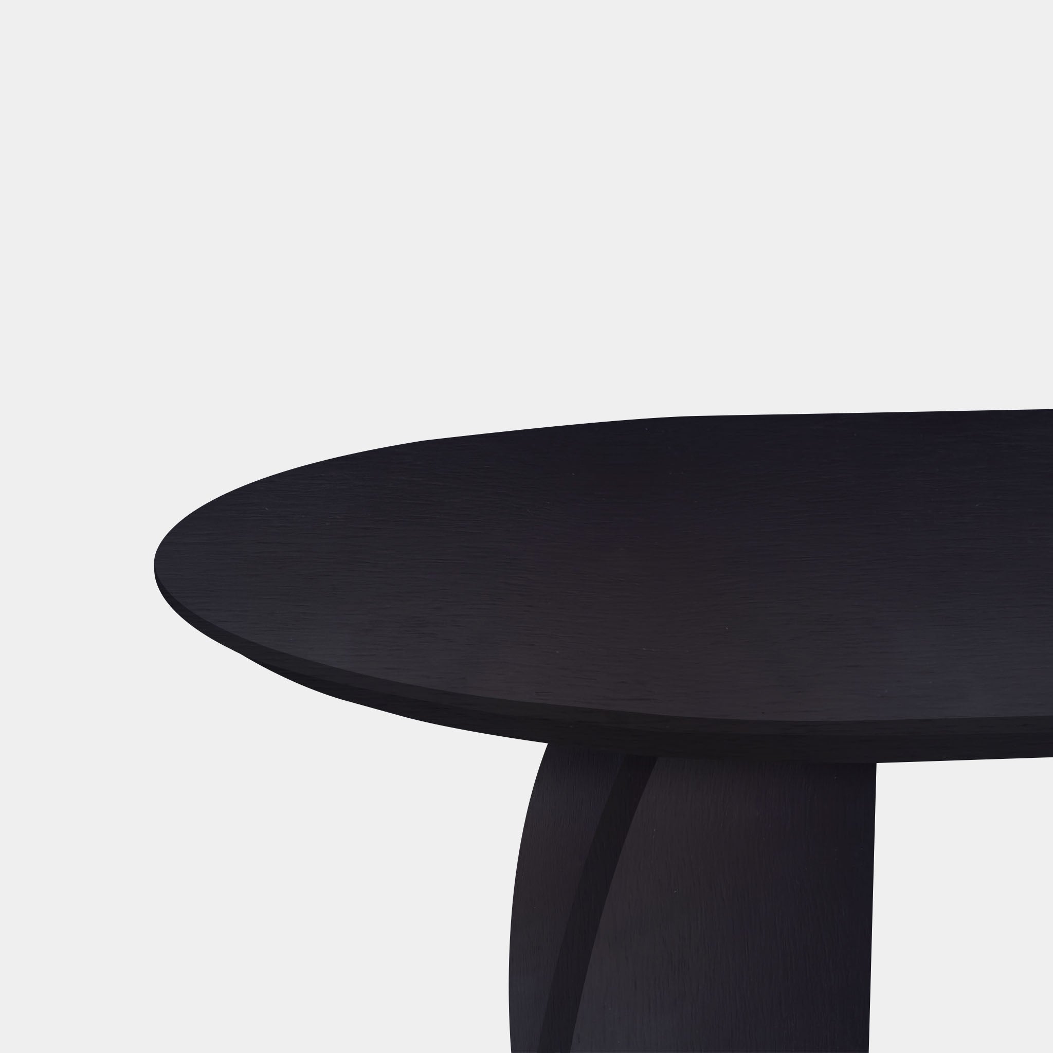 Deze indrukwekkende plat ovale tafel van massief eikenhout, afgewerkt in de klassieke kleur Donker Eiken, straalt kracht, elegantie en tijdloos vakmanschap uit. Het afgeronde, afgeplatte blad zorgt voor een vloeiend en harmonieus silhouet, terwijl het robuuste half rond onderstel, meegespoten in dezelfde tint, zorgt voor een solide en visueel gebalanceerd geheel.