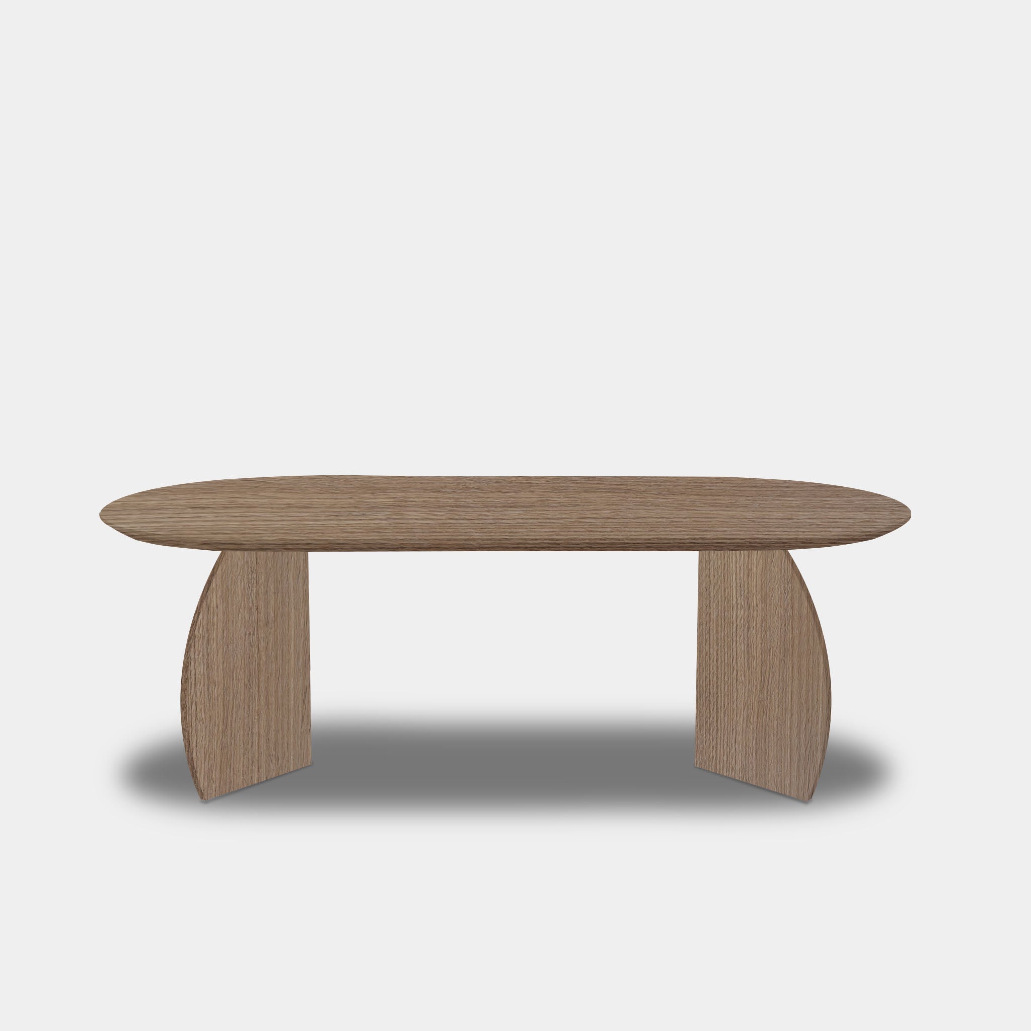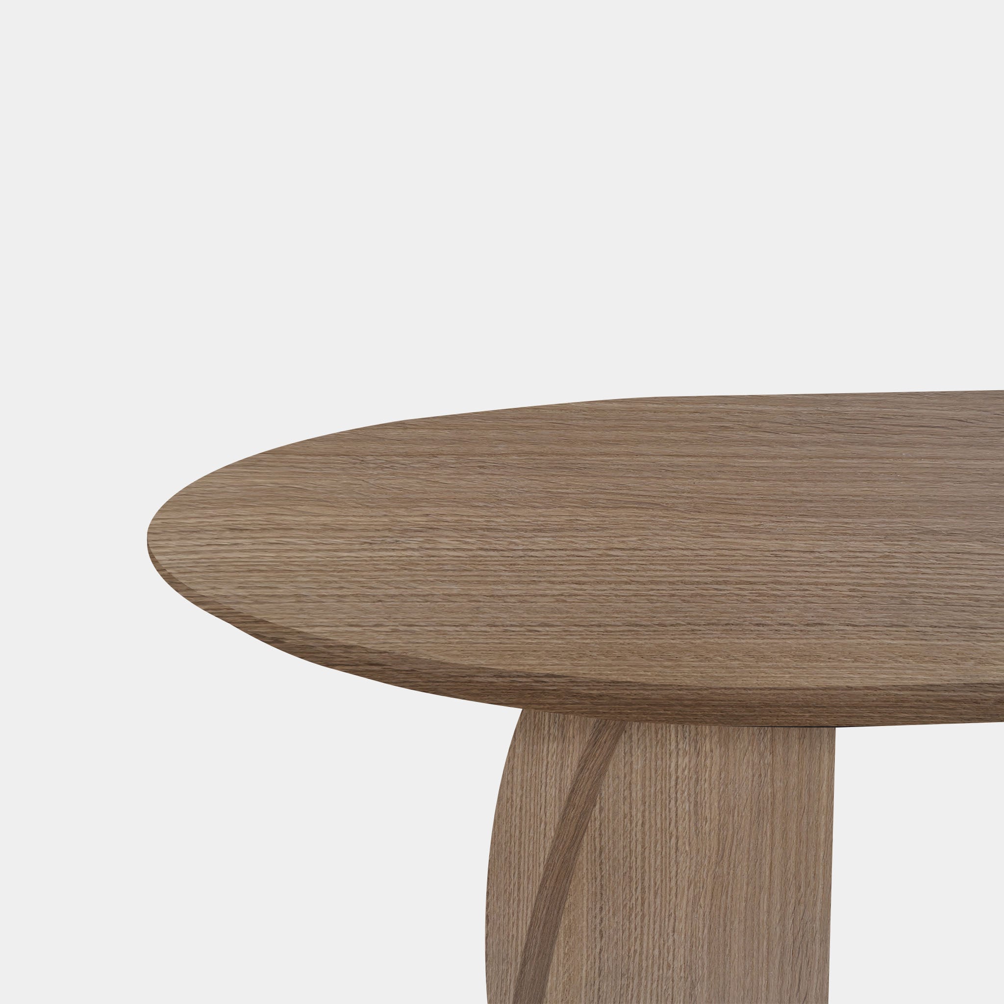 Deze elegante plat ovale tafel van massief eikenhout, afgewerkt in de frisse, natuurlijke kleur Pura Natura, brengt Scandinavische rust en modern vakmanschap perfect samen. De vloeiende, afgeplatte ovale vorm zorgt voor een zachte en ruimtelijke uitstraling, terwijl het stevige half rond onderstel, meegespoten in dezelfde tint, zorgt voor een stabiele, stijlvolle basis.