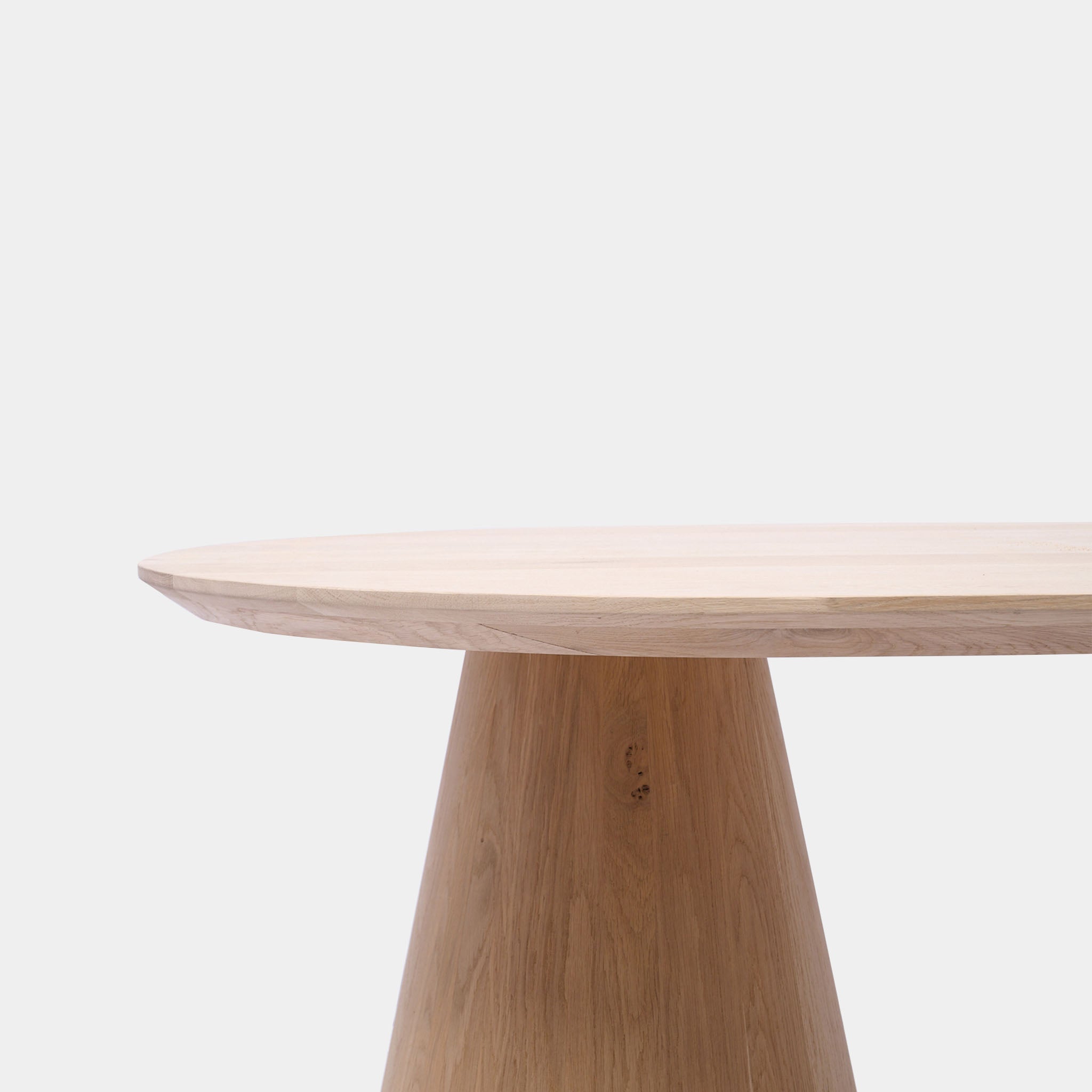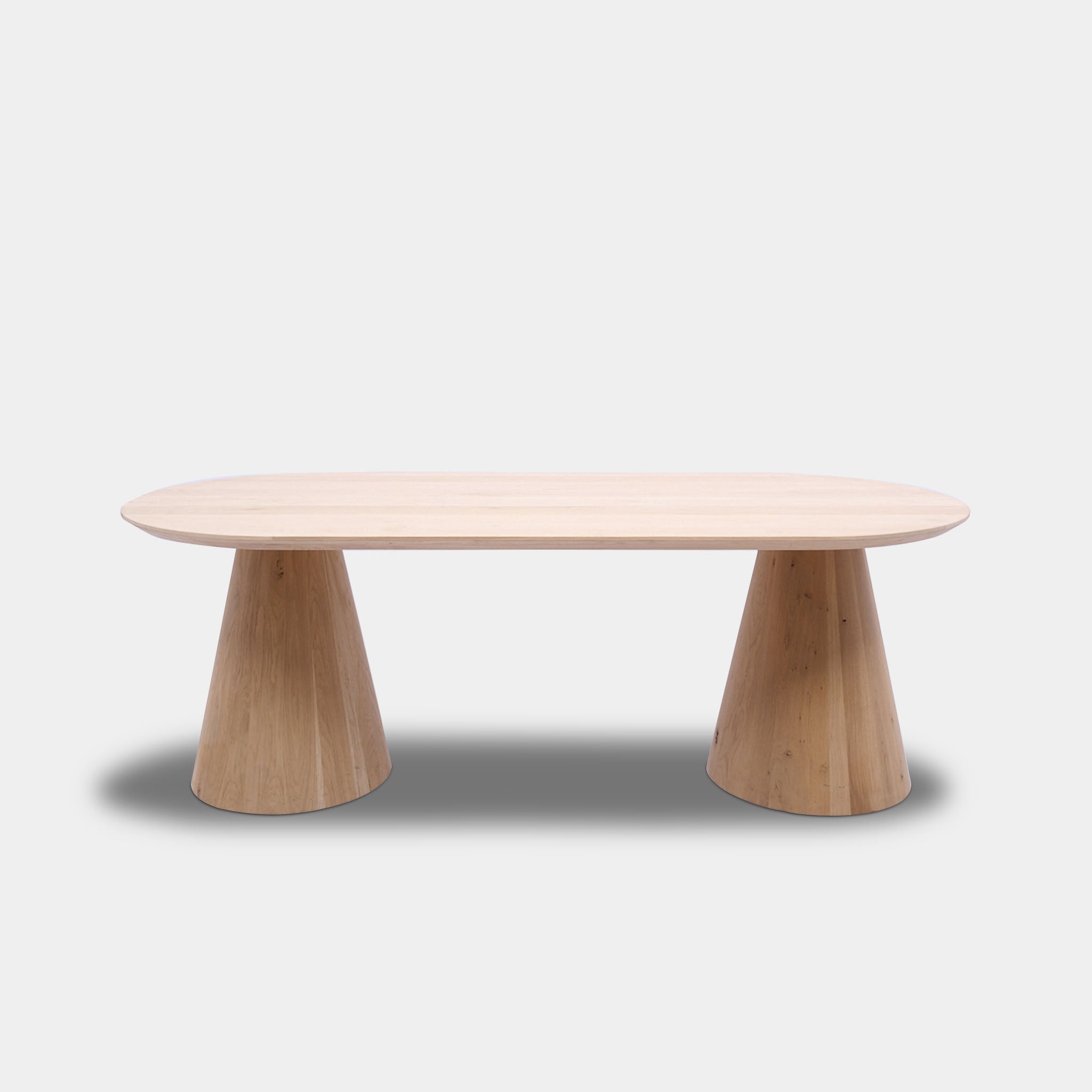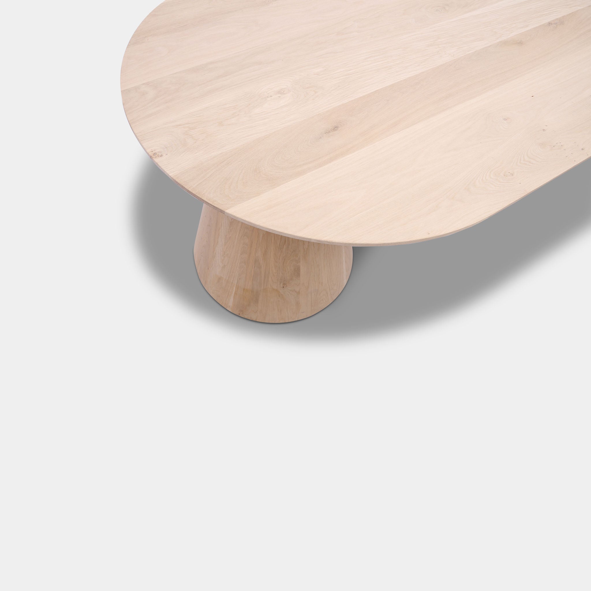 Deze stijlvolle plat ovale tafel van massief eikenhout, uitgevoerd in een onbehandelde afwerking, straalt puurheid, eenvoud en ambacht uit. De moderne, afgeplatte ovale vorm geeft de tafel een vriendelijk en vloeiend silhouet, terwijl de set van vier kegelpoot poten zorgt voor een luchtige en stabiele basis met een subtiele, verfijnde uitstraling.