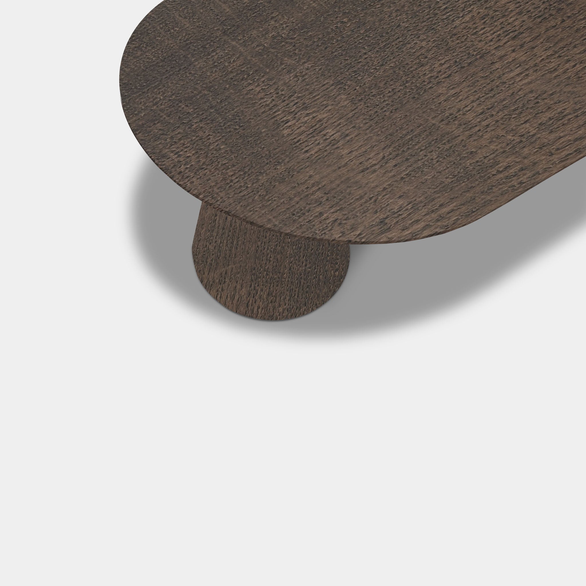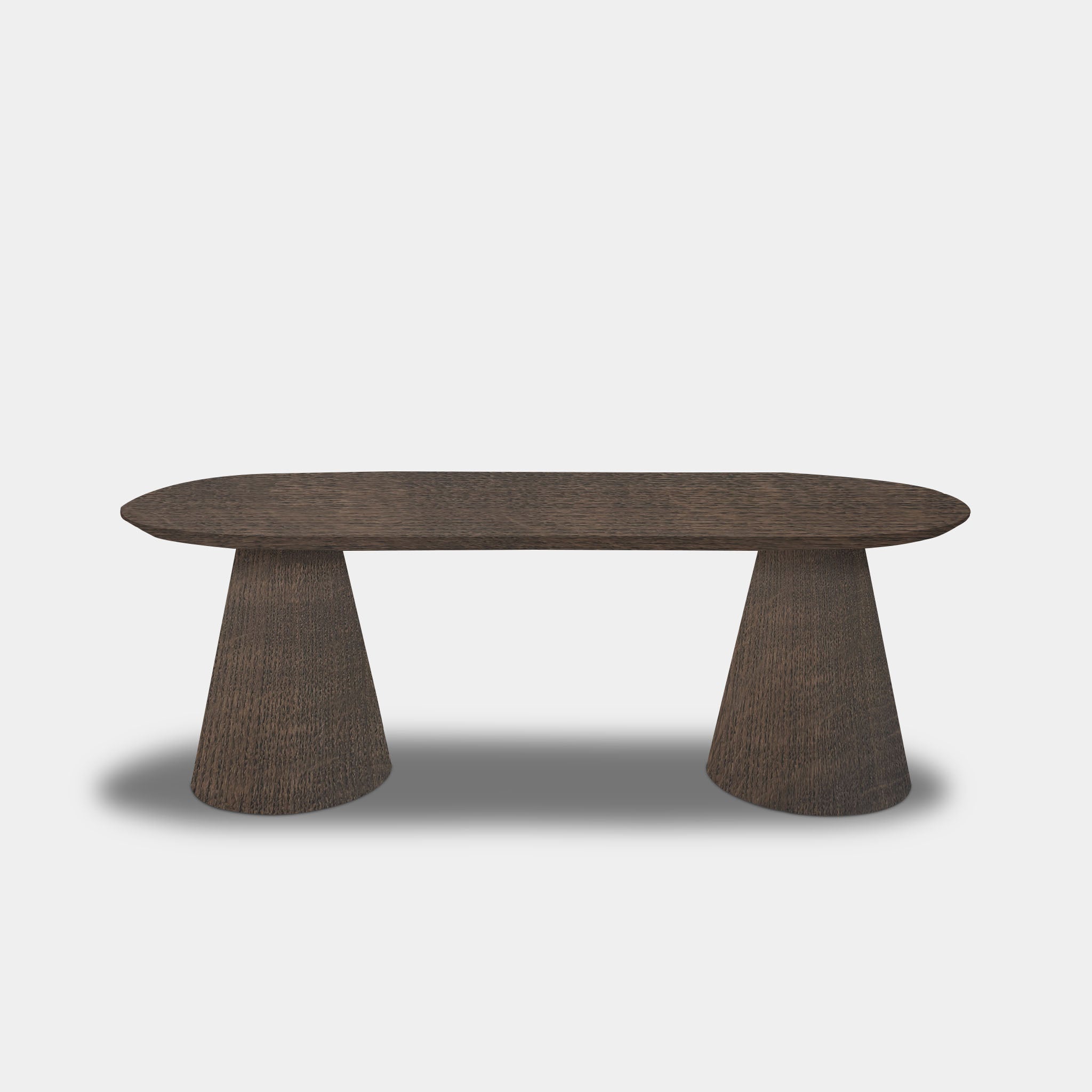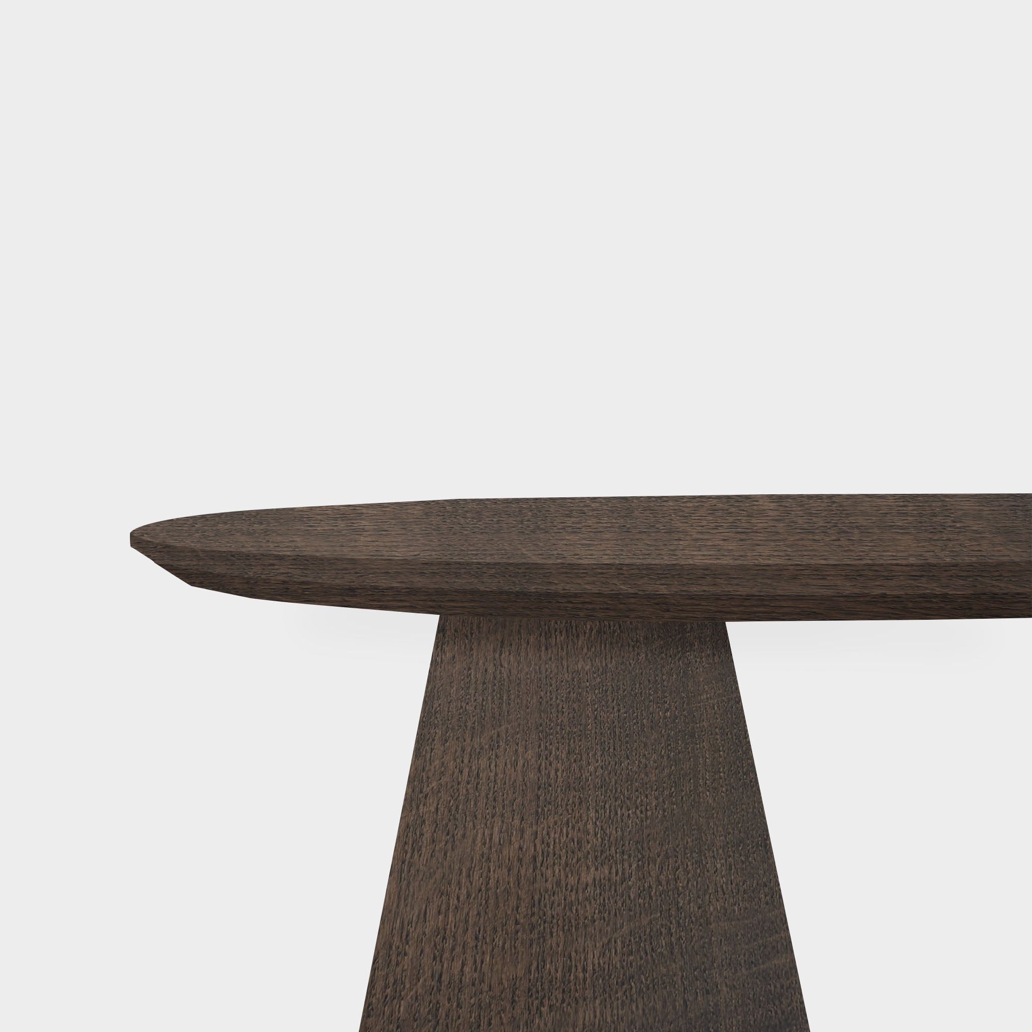 Deze lichte en verfijnde plat ovale tafel van massief eikenhout, afgewerkt in de natuurlijke kleur Zand, straalt rust, helderheid en modern vakmanschap uit. De elegante, afgeplatte ovale vorm zorgt voor een ruimtelijk effect, terwijl de set van vier kegelpoot poten, meegespoten in dezelfde tint, zorgt voor een visueel licht en stabiel onderstel.